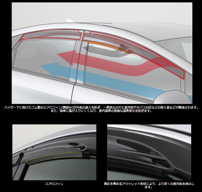 ■窓を開けた際の急激な室温変化と後席への風の巻き込みを最小限に抑えつつ優れた換気性能を発揮する。